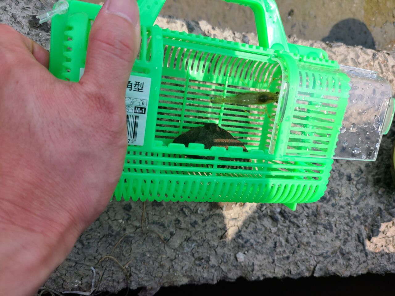 今回から釣れたら虫かごに入れてビク代わりにしておきます(^O^)