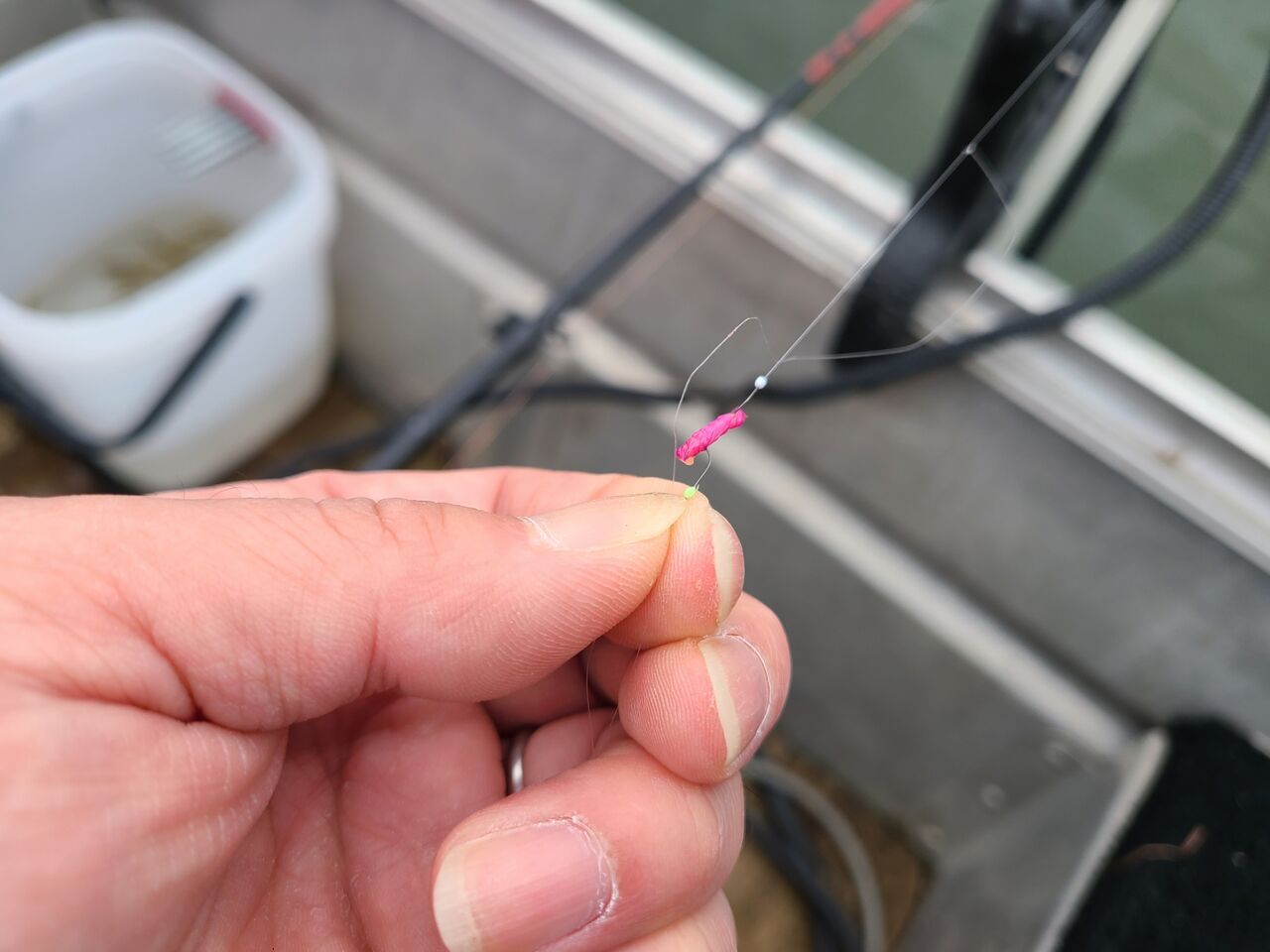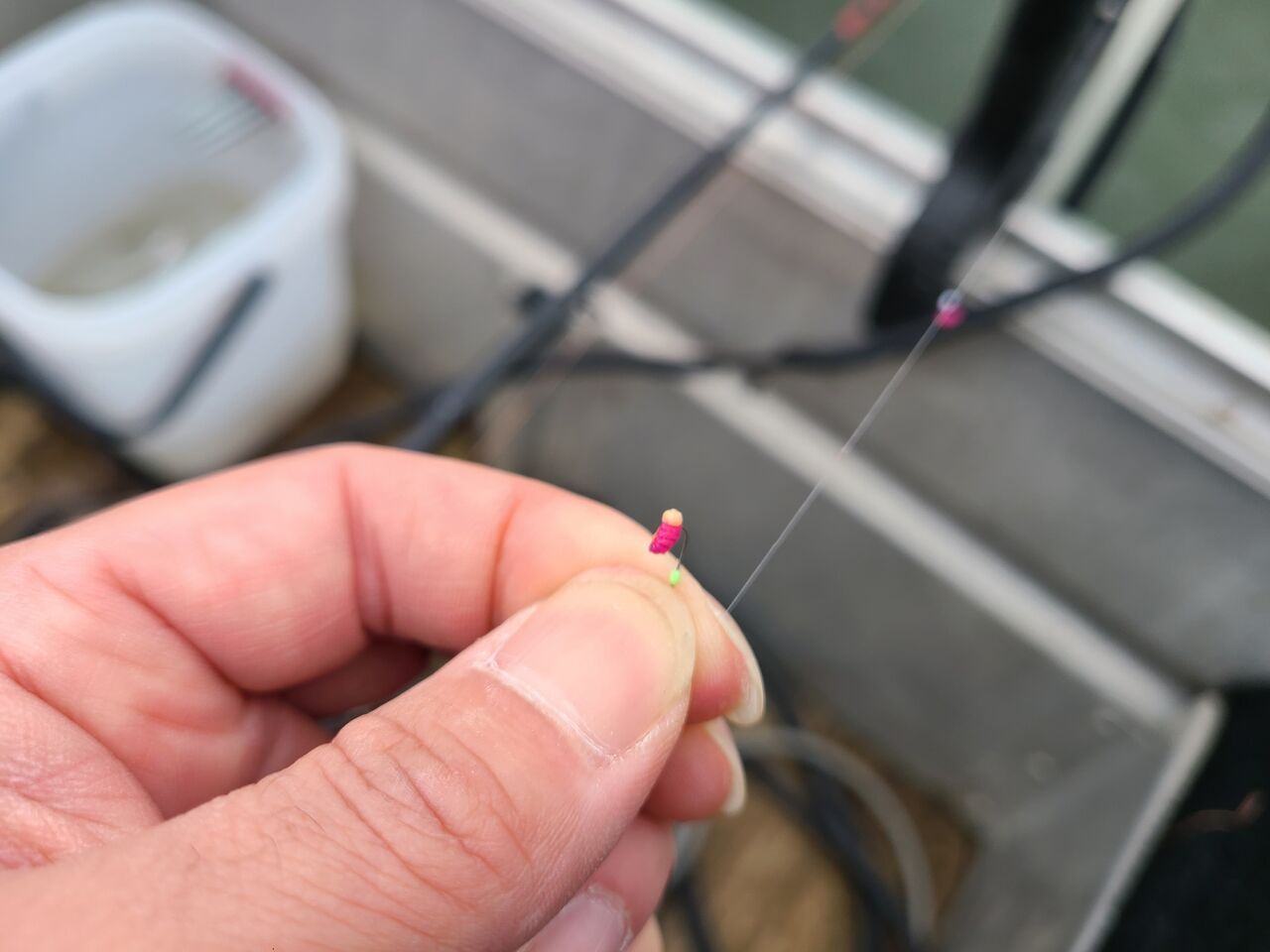 仕掛けの一番上にマルキューの寄せっこを付けるとワカサギの集まりがいいですよ