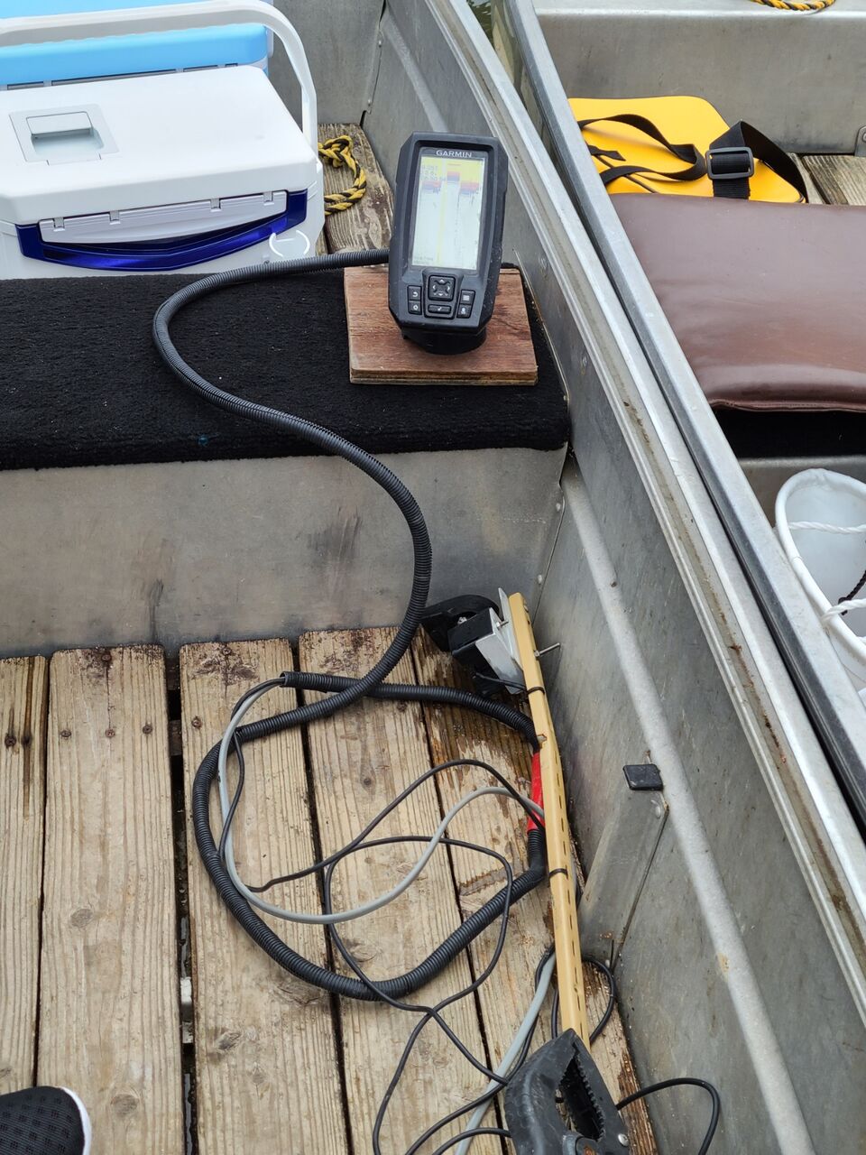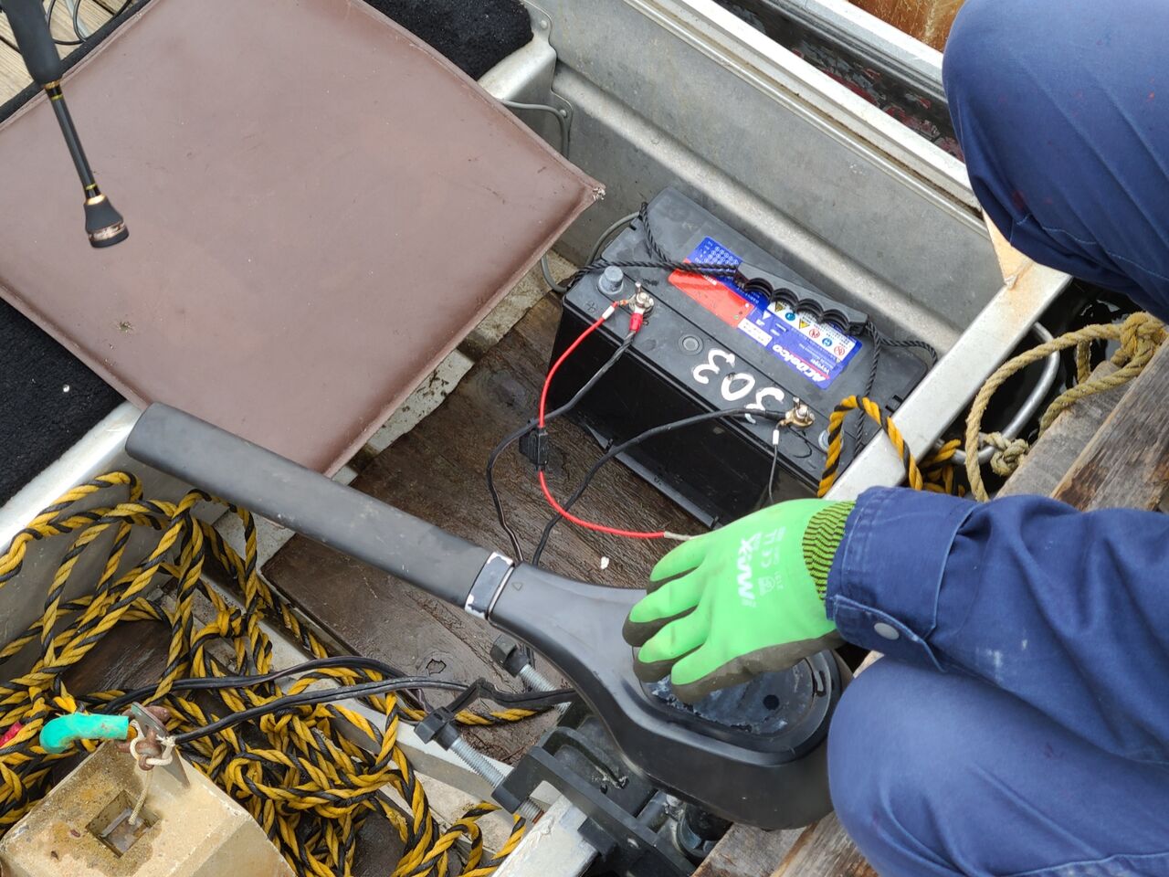 ボートハウスに帰り、ワカサギを金属探知機にかけます