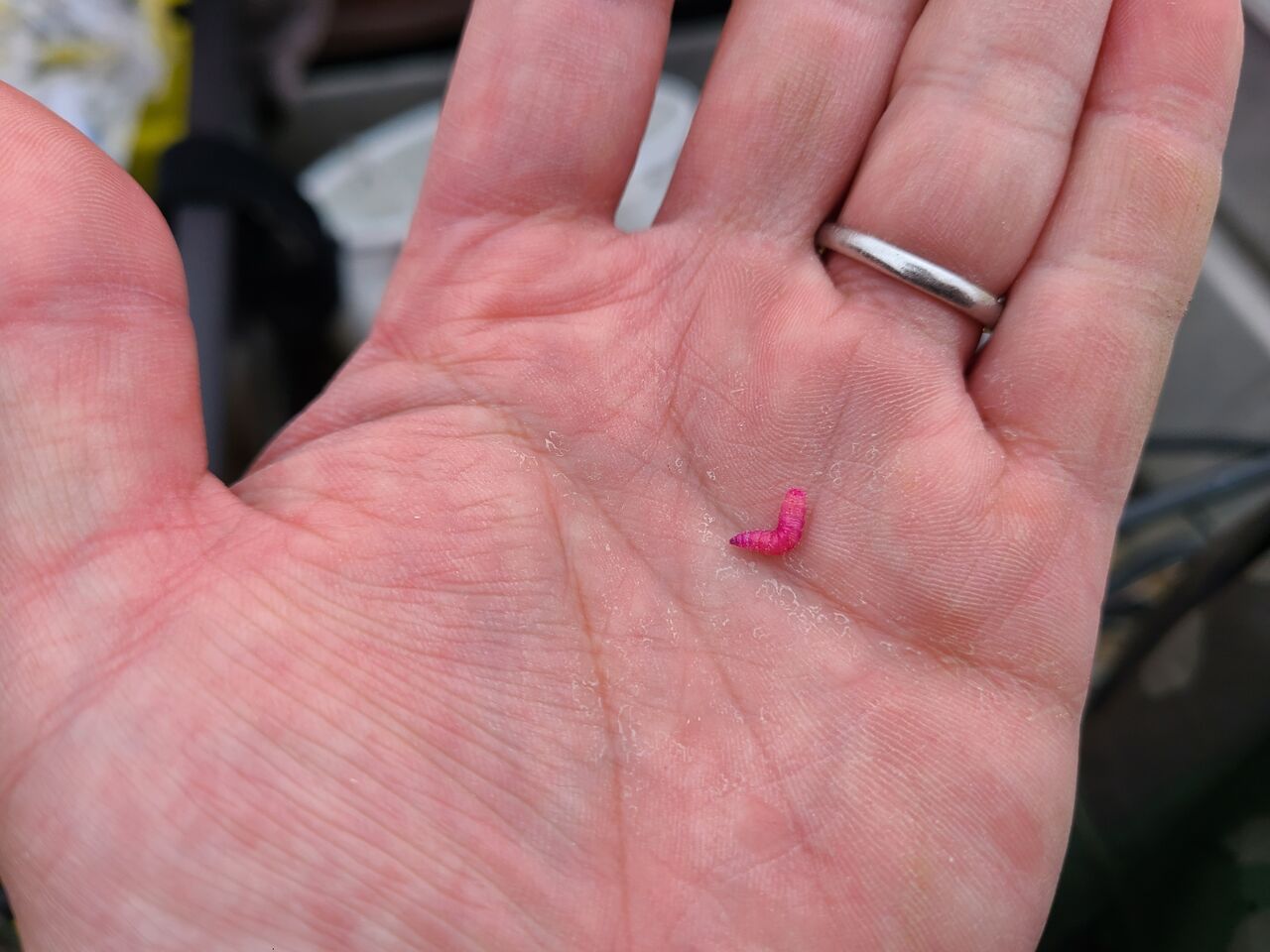 ワカサギが小さいとサシ虫1匹では喰いが悪いので可哀想ですが切りましょう