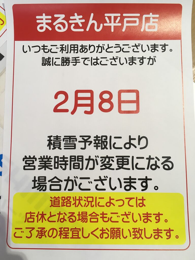2月8日 積雪、路面凍結による営業時間のご連絡。
