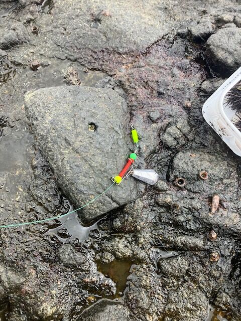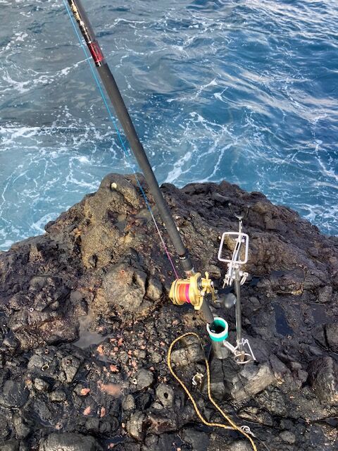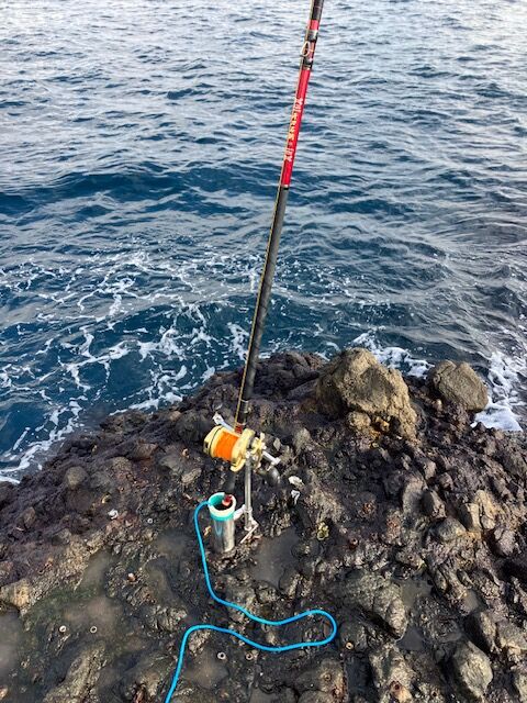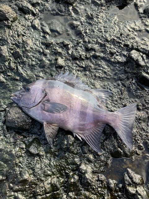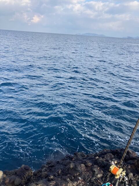 この調子でさらに連発を狙いますがその後は魚を掛けるも仕掛けが引っかかってバラシたり、風向きが変わってうねりの方向が変わって釣り座が波を被ったりする状況に